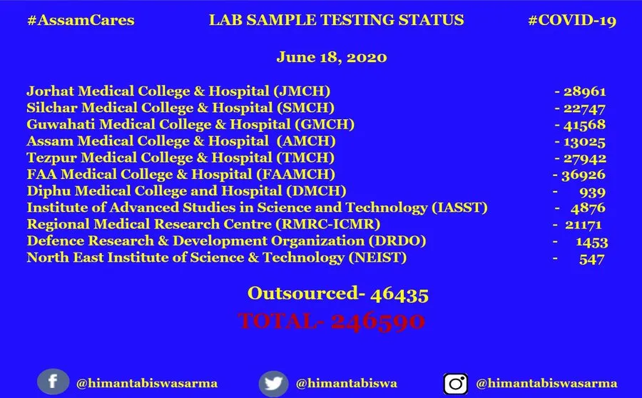 Assam Health and Family Welfare Minister Himanta Biswa Sarma on Thursday announced that the state hits 2,46,590 COVID-19 tests today, which is 11000 plus than the tests conducted on June 17.