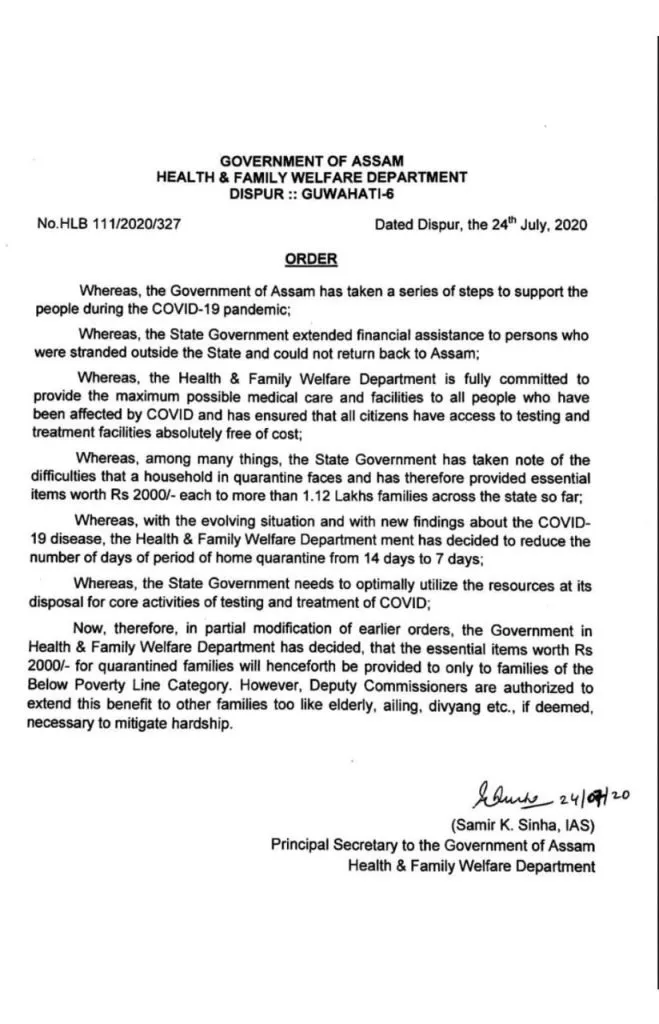 With the evolving situation, Govt of Assam has decided to reduce the home quarantine period after discharge from hospital to 7 days. As such we will not provide essential items worth Rs 2000/ except to the families living under BPL, elderly people, ailing and to Divyangjan. pic.twitter.com/PfV9Hyq1Uh