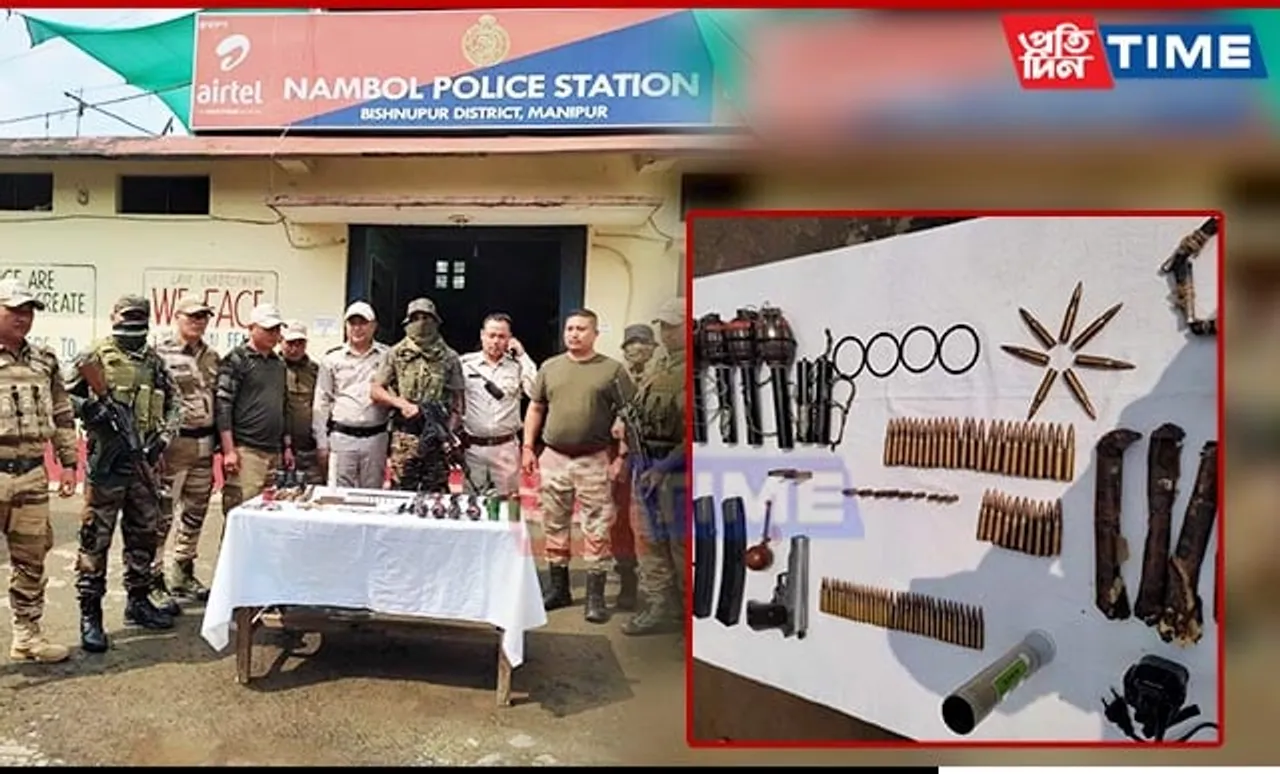 01 (one) no. of Carbine with two magazine, 01(one) no. of 9mm Pistol with magazine, 04 (four) nos. of 36 HE grenade live, 50 (fifty) rounds of live ammunitions, 05 (five) PEK sticks of IED weighing approx. 750 grams, 06 (six) nos. of SLR tube launcher, 01 (one) no. of 75 detonator, 08 (eight) nos. of 36 Hand Grenade arming ring, 02 (two) nos. of Ballistic cartridge, 01 (one) no. of Tear shell, 01 (one) no. of C90 MK 3 grenade, 02 (two) nos. of 80grenade MK-1(WP), 01(one) no. of Bicard Strip and 02 (two) nos. of walkie-talkie with one charger from Aimol village and Irengbam Maning, Bishnupur District.